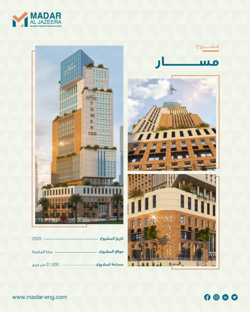 As part of the Masar Project in Makkah – Umm Al Qura Development Company, Madar Al Jazeera Engineering Consultants was responsible for developing the architectural concept of a tower project. The development is a mixed-use high-rise comprising commercial, administrative, and hotel residential functions across 30 floors. The architectural approach blends contemporary design with respect for local Hijazi architectural heritage, reinterpreting traditional elements such as rawashin and protruding façades through a modern lens that reflects both cultural identity and current urban development standards.